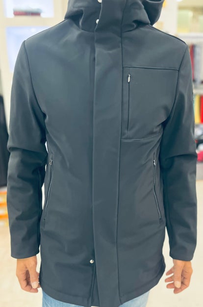 Giubbotto Lumberjack modello 3/4 in tessuto tecnico elastico. Fodere interna e nelle tasche in velour. Chiusura con zip e bottoni. Tessuto esterno antivento e idrorepellente. Dettaglio di loro laterale. Tasca interna.