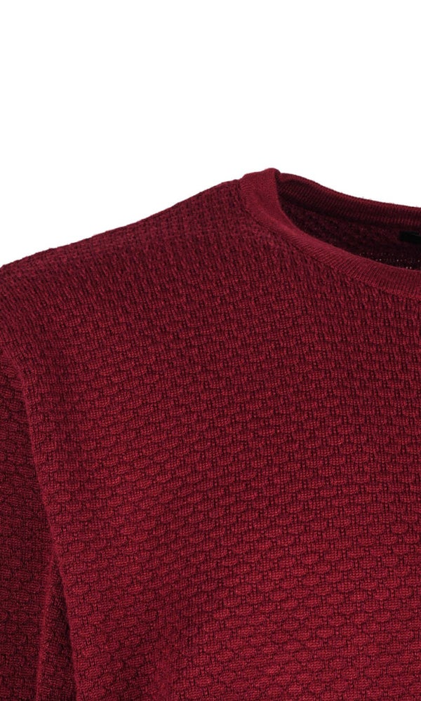 Girocollo con lavorazione a nido d'ape in viscosa. Dettaglio di logo sul fondo.