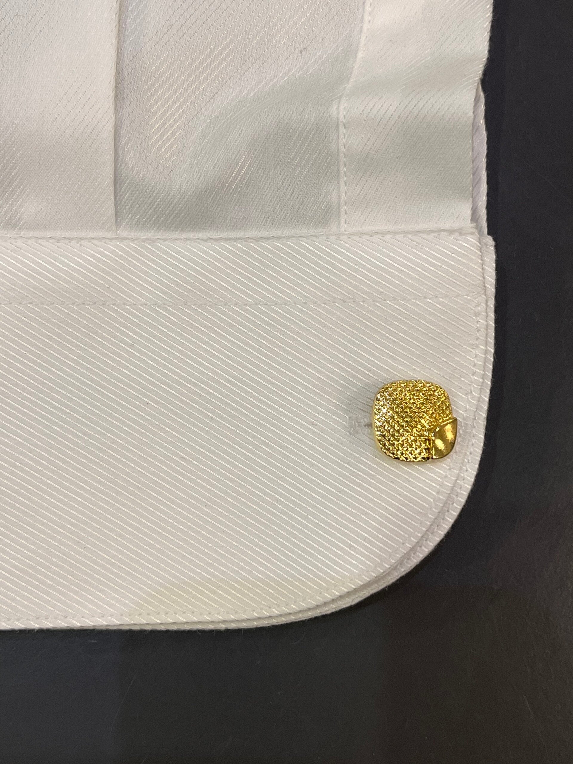 Gemelli color oro, forma quadrata bombata con texture micro-puntinata che cattura riflessi eleganti e discreti. Design bold e sofisticato: perfetto per sposi moderni che vogliono un dettaglio raffinato e fotogenico.